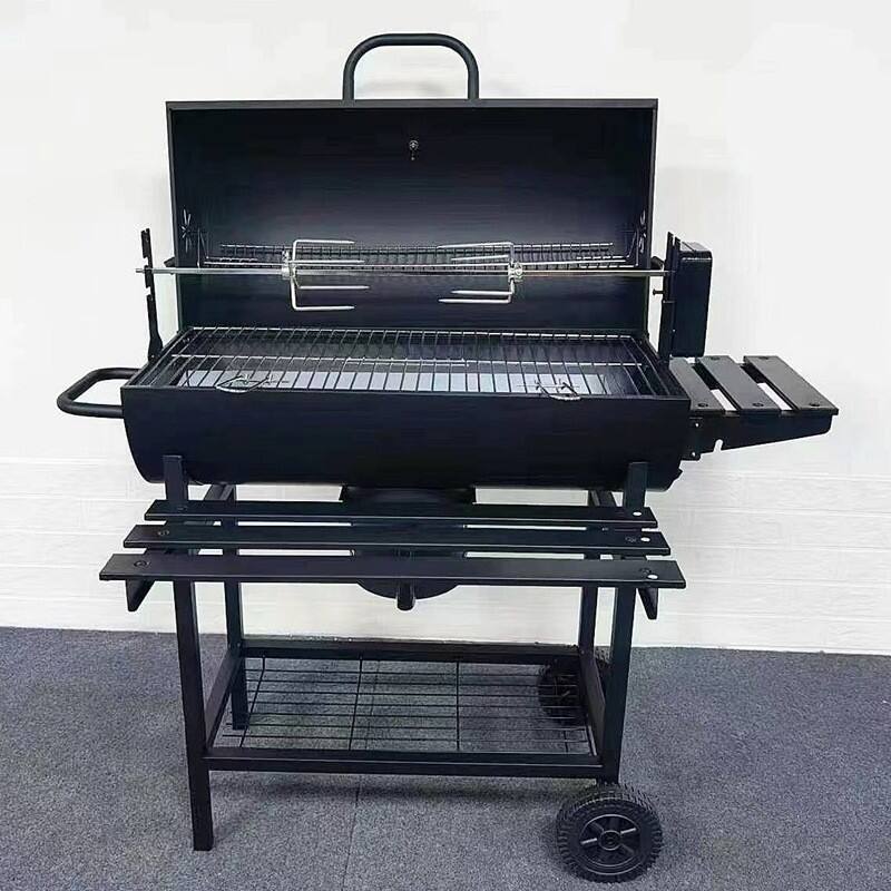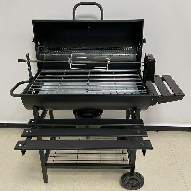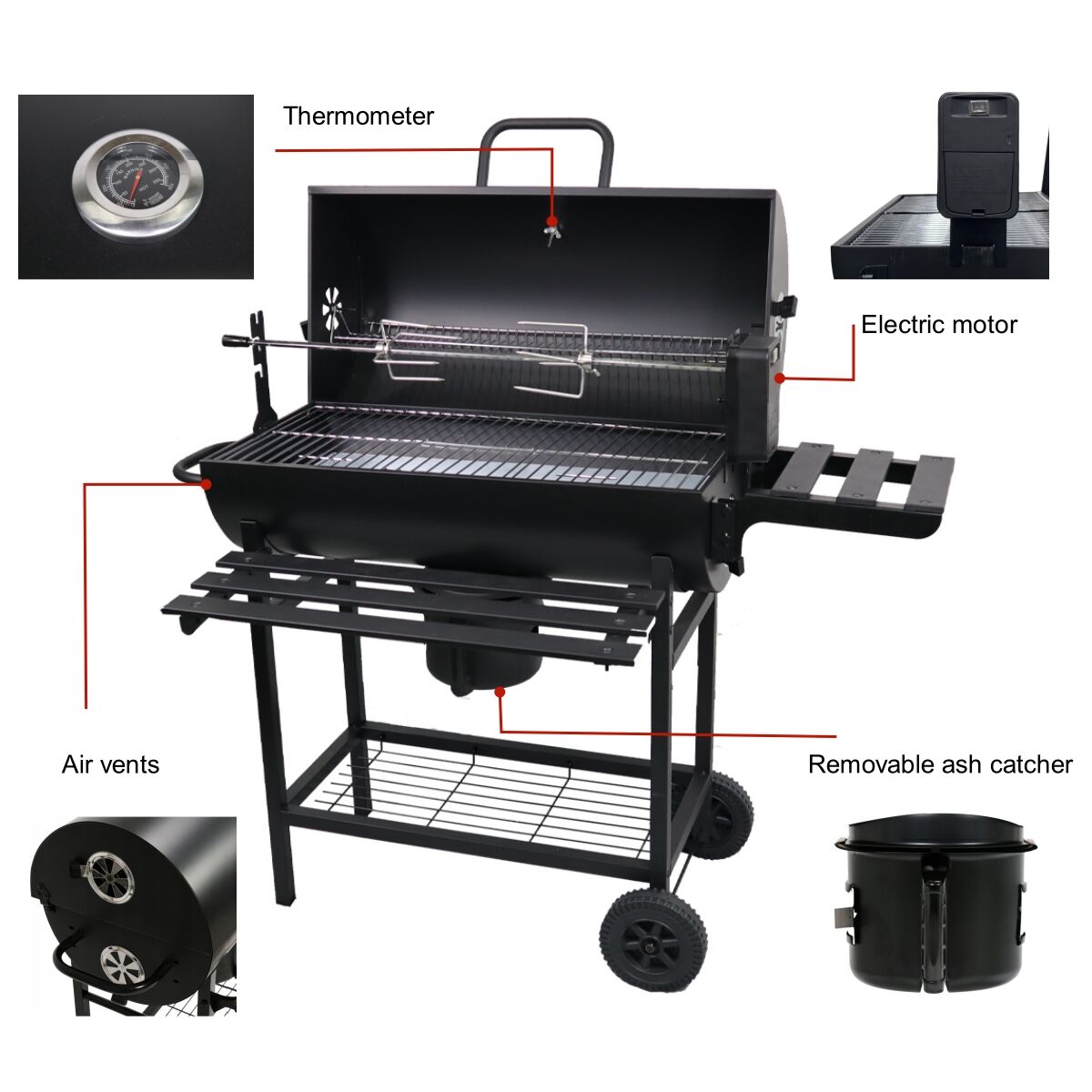 Pastime® SCB-23-02 The charcoal grill with motor rotisserie kit is perfect for family use and even when having a few friends over. It features a foldable side shelf and front board for storage. Thanks to the wheels, you can move the grill easily. The removable ash tray is also designed for easy cleaning. Furthermore, it can provide you with 2 cooking styles, roast chicken mode and grilling mode. If you want a roast chicken mode, you can place the whole chicken on the spit and let it roast automatically. If you choose grilling mode, just barbecue as usual.