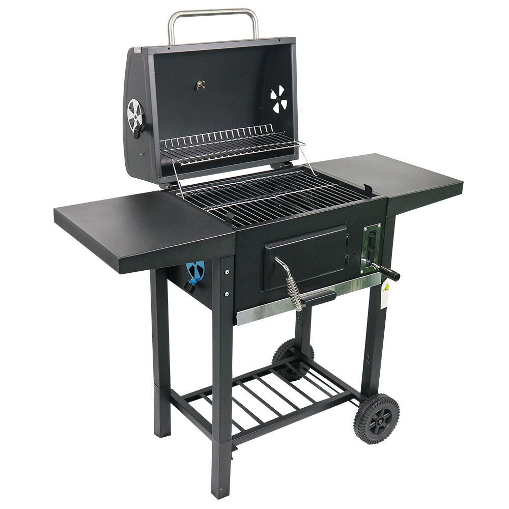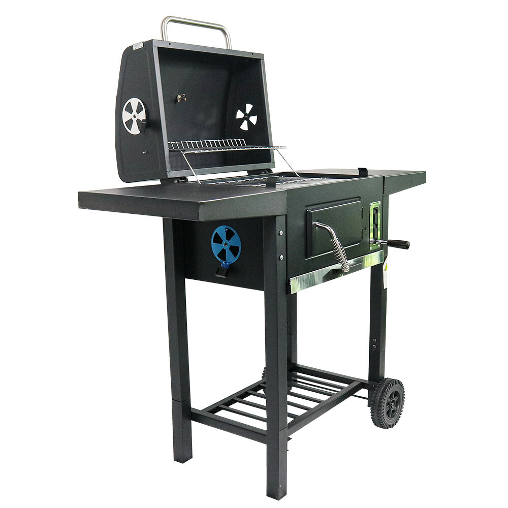 Pastime® SCB-02-01 The Trolley Charcoal Grill with large total cooking space, including grilling surface and warming rack for even heat distribution is an excellent option for the outdoor barbecue party.The Square cooking grid design provides a spacious and even cooking surface, perfect for grilling all kinds of food with precision. Its multifunctional design includes side shelves for easy preparation, a sturdy frame for durability, and smooth wheels for effortless mobility. The trolley wheels is portable, making it an ideal option for camping and travel.